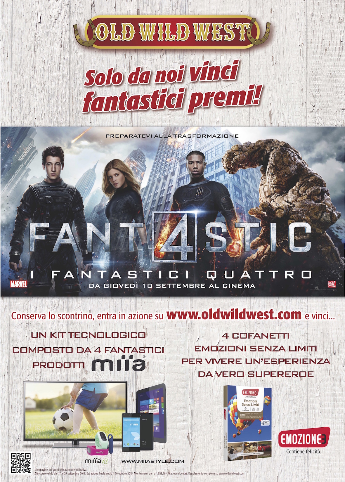 Fino al 27 settembre 2015, un nuovo concorso a premi attende da Old Wild West tutti gli amanti del cinema e soprattutto degli hamburger, dei piatti a base di carne italiana e argentina alla griglia e delle specialità Tex-Mex. Infatti la catena di steak house, famosa per le sue ambientazioni in perfetto stile western, lancia il concorso "Vinci con Old Wild West e i Fantastici 4", grazie al quale è possibile vincere quattro cofanetti Emozione 3 Senza Limiti oppure il ricco kit MIIA composto da, appunto, i fantastici quattro, ovvero un orologio fitness Mia Fit Blu, un tablet MWT-963G, uno smartphone MP-47 e un TV LED 50 pollici.