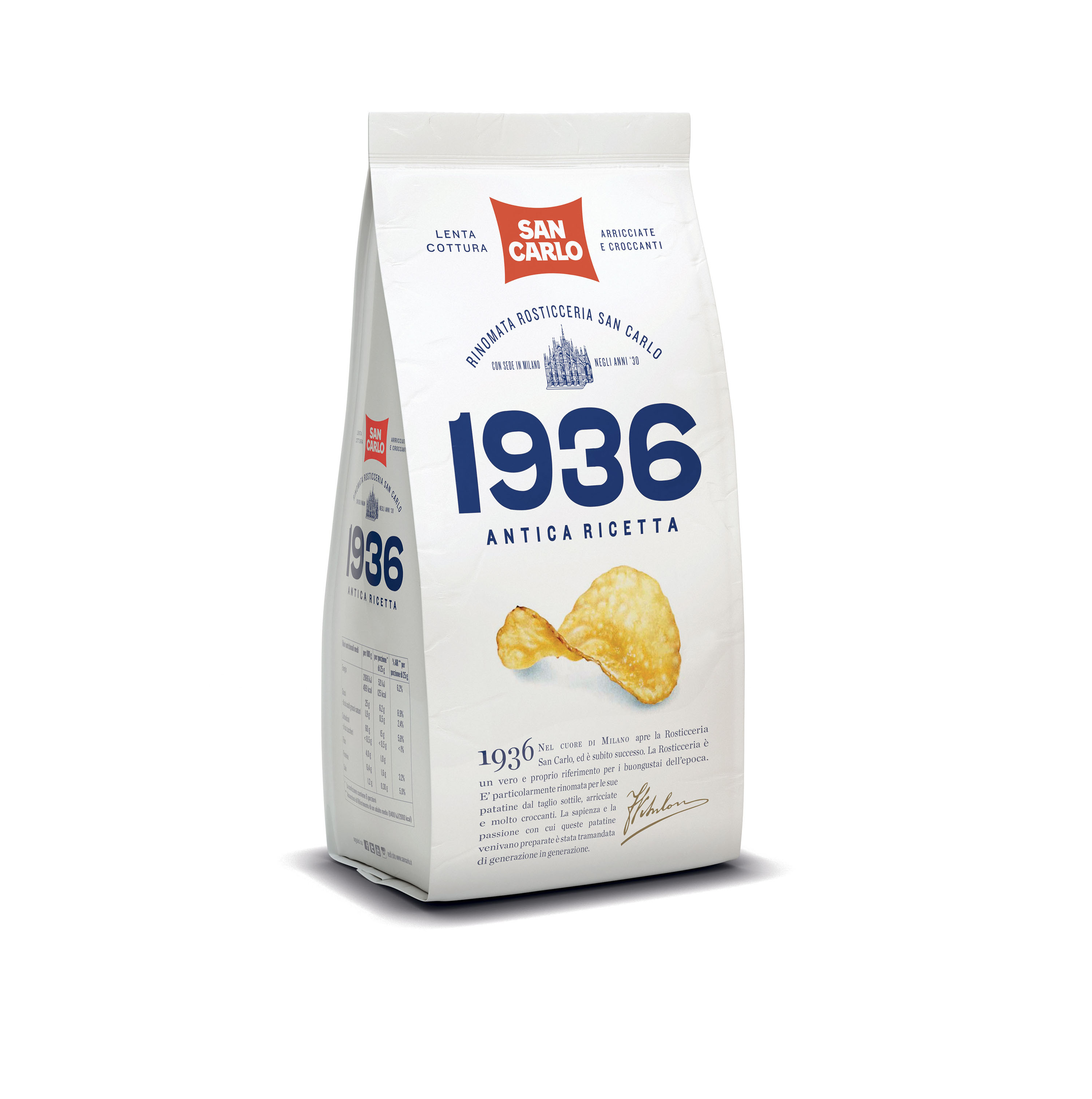 Il Gruppo San Carlo preserva in tutti i suoi prodotti la qualità e l’eccellenza di una volta, grazie al miglioramento continuo, alla ricerca di materie prime di qualità e alla capacità di coniugare tradizione e innovazione. La sapienza e la passione della Rosticceria San Carlo, tramandata di generazione in generazione, viene oggi celebrata con “1936 Antica ricetta”: patate di prima qualità, arricciate e croccanti, cotte lentamente a temperature diverse in olio di girasole e spolverate con un pizzico di sale marino. Un nuovo prodotto che richiama l’originale preparazione di una volta anche nel packaging, che porta nel presente le storiche patatine attraverso una grafica evocativa: la firma del fondatore Francesco Vitaloni sul fronte del pack, alcune foto storiche della “Rosticceria San Carlo” e la sua targa originale, il Duomo di Milano, simbolo della città che ha visto l’azienda diventare grande.
