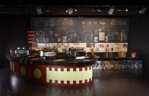 Nell’allestimento, ideato da GruppeGutGestaltung, spicca un elemento architettonico retroilluminato a forma di onda che si snoda al centro dell’intero spazio espositivo e lungo il quale prendono forma i trenuclei tematici rappresentati. Questi ultimi, a loro volta, sono identificati da suggestivi elementi visivi: unarulliera, a richiamo della linea produttiva di uno stabilimento (sezione azienda e persone), una penisola ricoperta da 100 kg di caffè (sezione prodotti e tecnologie), una base espositiva che ricorda una strada asfaltata (sezione sport e ciclismo).
