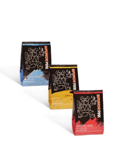 Con le nuove capsule compatibili ogni momento della giornata potrà essere scandito, a casa o in ufficio, dalla cremosità del caffè Bonomi gustato al bar. Confezionate in pratici blister da 10 unità, le capsule presentano un involucro trasparente per esaltare il colore bruno delle pregiate miscele e un sigillo ermetico a tinte vivaci per preservare la fragranza del caffè appena macinato. Come scegliere e riconoscere il proprio gusto preferito?: giallo Kaffa, rosso Special Bar e celeste Decaffeinato.
