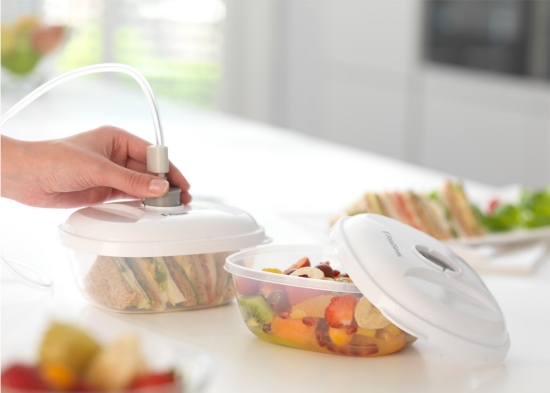 Una vera rivoluzione nella gestione del pasto fuori casa, soprattutto per chi ha poco tempo: nel fine settimana o nel giorno libero basterà infatti programmare i pranzi dei cinque giorni successivi, collocarli in diversi contenitori e lasciarli in frigorifero prelevandoli di giorno in giorno. Barattoli e contenitori (disponibili sia in formato rettangolare che rotondo) sono estremamente comodi, si possono impilare, mettere nel forno a microonde e lavare in lavastoviglie. Una volta collocato il pasto all'interno, anche se si tratta di una semplice insalata o di alimenti friabili, basta chiudere con lo speciale tappo e collegarlo attraverso l'apposito tubicino a una delle macchine per il sottovuoto FoodSaver, che provvederà ad estrarre l’aria, principale causa del deterioramento del cibo.
