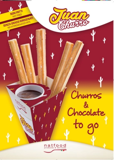 Lo sguardo di Natfood, sempre rivolto al mercato internazionale, ha focalizzato l’attenzione sullo sviluppo di nuovi concept di tendenza per l’asporto. Cogliendo le potenzialità dello street food come nuovo mercato in rapida evoluzione, Natfood ha presentato ad Host una grande novità invernale. Dopo i recenti lanci di Willy Waffle, il waffle da asporto, Gaufre Ella, Crepe Susanna e Mr Joe, tutti prodotti pensati per il consumo on the go, nasce Juan Churro, fragrante golosità servita con cioccolata calda Cioconat. I churros sono bastoncini di pastella sfiziosi, ricoperti di zucchero, tipici della Spagna. Si gustano caldi e croccanti, accompagnati da Cioconat, nella quale intingerli uno ad uno. Il prodotto nasce in polvere, è veloce da preparare, non fritto, ma cotto con una piastra specifica che non necessita di cappa di aspirazione. Juan Churro è ideale per una merenda golosa e originale o per un divertente fuoripasto, per chi desidera scoprire gusti e tradizioni di altri paesi. Juan Churro viene presentato in doppia versione, da asporto, con un pratico contenitore facilmente impugnabile per un consumo divertente, oppure da tavolo per un consumo tradizionale. Il progetto è inoltre supportato da materiali di comunicazione: menu da tavolo, totem e crowner, oltre che dai materiali per il servizio da asporto. (Shelf life 18 mesi, busta da 1 Kg, 10 buste per cartone)