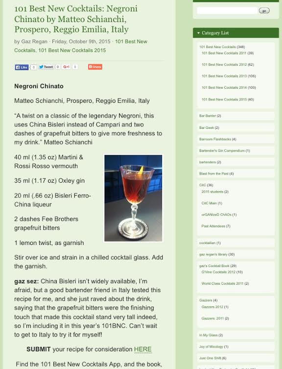 È un twist on classic, ovvero una rivisitazione del leggendario Negroni, che ho presentato al Martini Grand Prix di Roma. Ho sostituito il Campari bitter con le note speziate del liquore alla China che lo rende più "dolce" e aromatico e ho aggiunto tre gocce di Bitter al Pompelmo che gli danno la giusta freschezza. Va mescolato con ghiaccio, servito in una coppetta Martini e guarnito con una scorza di pompelmo.