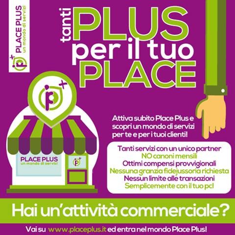 Si chiama Place Plus e rappresenta un’opportunità per gli esercenti che vogliono incrementare il proprio business ed offrire più servizi ai propri clienti. Una realtà nuova e innovativa - proposta da professionisti con lunga esperienza nel settore - che si propone come partner unico per l’erogazione di servizi (Plus) al cittadino effettuati attraverso bar, tabaccherie, ristoranti, hotel, pub, e così via (Place).