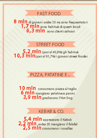 Format Se poi parliamo della tipologia di ristorazione più in voga, notiamo immediatamente che i Millennials sono dei sobri politeisti, in grado di mixare con equilibrio stimoli diversi che spaziano dal fast allo slow food, passando per enclave territoriali come lo street food e senza mai disdegnare un ever green come la pizza. Fast food: vi mangiano 8 milioni di under 35, di cui 1,7 milioni abitualmente e 6,3 milioni di tanto in tanto (il 56,1% ed è il 34,3% il dato medio nazionale). Parlando invece di street fooder italiani con meno di 35 anni vediamo che sono 10,3 milioni (91,7%) di cui 5,2 milioni consumatori abituali (45,9%). 10 milioni di giovani mangiano piazza al taglio e 6 milioni patatine fritte e panini. Il Kebab è apprezzato da 5,4 milioni di giovani, il falafel da 2,2 milioni di consumatori under 35, l’hot dog e il take away asiatico da 3,9 milioni di Millennials italiani, mentre 2,5 milioni consumano noodles.