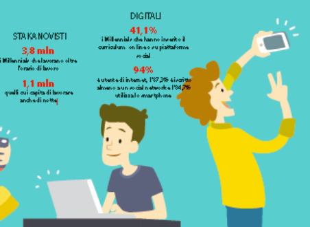 Ce li hanno raccontati come dei “bamboccioni”, attaccati alla gonna di mammà. E come degli schizzinosi, “choosy” e selettivi, nei confronti di qualsiasi attività lavorativa ritenuta indegna. E invece dobbiamo ricrederci, perché i Millennials (i giovani compresi tra i 8 e i 35 anni) si rivelano intraprendenti, fortemente motivati, stakanovisti, sobri, strenui fautori del proprio io, ma anche solidali e… accomodanti. Il loro è un universo tutto da scoprire. E da apprezzare, mettendo da parte pregiudizi e luoghi comuni. È quanto emerge dalla ricerca Vita da Millennials: web, new media, startup e molto altro. Nuovi soggetti della ripresa italiana alla prova realizzata dal Censis per il Padiglione Italia di Expo 2015. Il risultato è un identikit che spesso contraddice l’immaginario collettivo, per esempio per quanto riguarda il mercato del lavoro, in questi anni divenuto sempre più ostico e farraginoso. Pare infatti che rispetto ai più “anziani” Baby Boomers, i Millennials non solo non abbiano “la puzza sotto al naso”, ma siano addirittura più propensi ad accettare contratti brevi (meno di 1 mese), lavoretti saltuari, qualifiche inferiori alla propria formazione, impieghi al nero o stage non retribuiti e questo nonostante abbiano dei plus importanti: sono infatti la prima generazione realmente bilingue e nativa digitale. Decisamente più accomodanti, insomma, quasi camaleontici, sono disposti ad adeguarsi rapidamente all’evoluzione socio culturale dilagante. Lo dimostra ad esempio il fatto che il 41,1% di loro ha inserito il proprio curriculum su piattaforme web o sui social media, mentre tra gli adulti la percentuale si arresta al 12,4%.