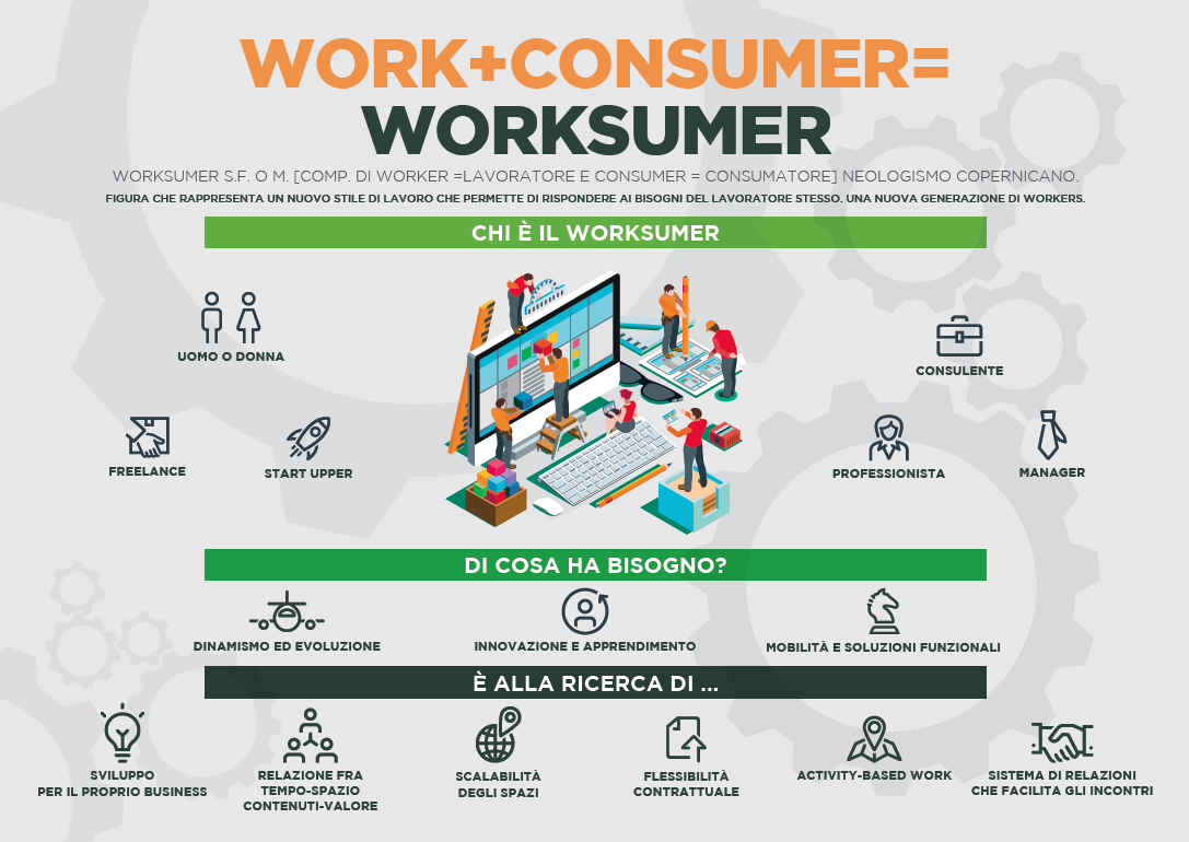 Il risultato? Un nuovo modello di fruizione degli spazi e del tempo del lavoro per un lavoro ormai sempre più “liquido” e flessibile in termini di spazio e tempo ed esigenze di consumo funzionali al lavoro. Ed è in questo “nuovo habitat” che nasce e cresce il Worksumer. Che non è solo il giovane startupper, o il creativo digitale, ma anche il professionista più maturo che trasferisce in questi nuovi spazi gruppi di lavoro o interi rami di azienda con l’obiettivo di avviare e stimolare scambio e innovazione.