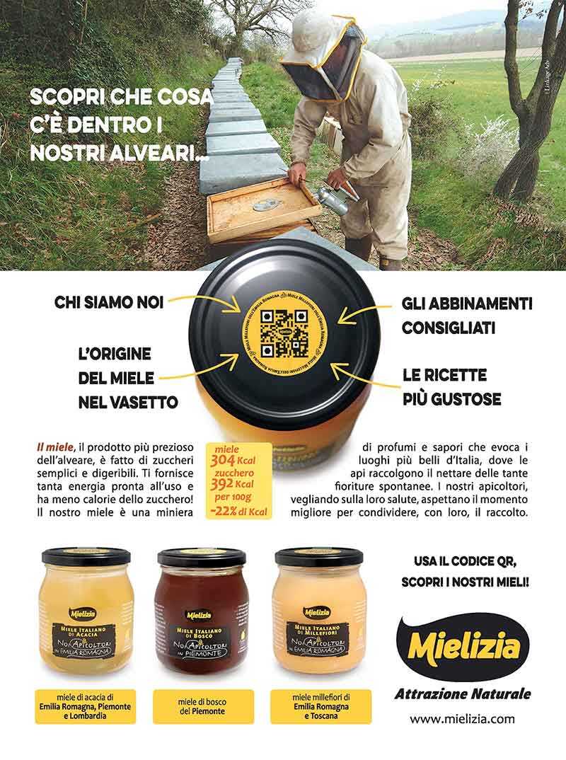 Spazio anche per la comunicazione sulla stampa consumer: il brand campeggerà, infatti, con la sua pagina istituzionale su numerose testate: Cucina Italiana, A Tavola, Più Dolci, Più Cucina, La Prova del Cuoco Magazine, Sale & Pepe, Cucina Moderna, oltre a Italo e Vie del Gusto, distribuiti su tutta la rete dei treni Italo e La Freccia Gourmet, la rivista distribuita da Trenitalia. La pagina, realizzata sempre da LinkageAdv, ha un taglio narrativo: il visual mostra un apicoltore al lavoro che scoperchia un'arnia ed è accompagnato da un messaggio in linea con l'immagine: "Scopri cosa c'è dentro i nostri alveari". Per farlo basta utilizzare il QR Code posto sulla capsula dei vasetti di miele, che rimanda a numerosi contenuti: chi è il Consorzio e cosa fa, l'origine del miele, gli abbinamenti consigliati e le ricette più gustose. La bodycopy elogia le virtù del miele, di cui sono riportate le principali informazioni nutrizionali in una tabella ad hoc. In basso, l'immagine di tre varianti di prodotto accanto al logo accompagnato dal pay off "Attrazione Naturale", a sottolineare il forte orientamento al rispetto della natura che riunisce gli apicoltori del Consorzio.