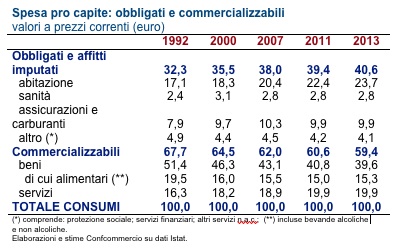 «Tra il 1992 e il 2012 la parte di consumi che le famiglie destinano a beni e servizi obbligati (inclusi gli affitti imputati, cioè la spesa teorica per l'abitazione attribuita alle famiglie che vivono in case di proprietà) è costantemente aumentata, passando dal 32,3% del 1992 al 40,5% del 2012. Particolarmente significativa – secondo il direttore dell’Ufficio Studi Confcommercio Mariano Bella - risultata la riduzione di quella parte della spesa che le famiglie orientano all'acquisto di beni commercializzabili, passata dal 51,4% del 1992 al 39,8% del 2012. Le stime per il 2013 confermano, accentuandola, la dinamica di lungo periodo, portando le spese incomprimibili a raggiungere il 40,6% della spesa complessiva sostenuta dalle famiglie. Un elevato contributo all'aumento dell'incidenza delle spese incomprimibili è derivato dall'abitazione (che comprende anche l'energia)».