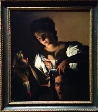 A breve distanza da quest’opera fa mostra di sé “Giuditta con la testa di Oloferne” di Carlo Saraceni (qui a sinistra). La giovane, dal volto apparentemente rilassato, tiene a sua volta il capo mozzato di Oloferne: qui la scena è intimamente illuminata da una fioca candela nelle mani della vecchina che regge il sacco destinato ad accogliere la testa decapitata.