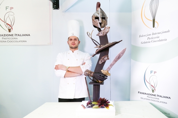 Si continua con Enrico Casarano, 24 anni, della città omonima in provincia di Lecce, che ha invece realizzato una pièce in cioccolato che rappresenta i pezzi più importanti dell’armatura del gladiatore: ben 7 ore di preparazione e l’attenzione minuziosa per i dettagli hanno permesso al giovanissimo pasticciere di vincere nella sezione cioccolato e praline.