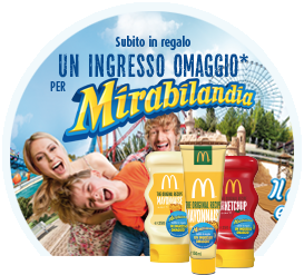 Questa la meccanica: mostrando alle casse di Mirabilandia il bollino presente sulle confezioni salse McDonald’s insieme allo scontrino d’acquisto in originale, a seguito di 2 ingressi interi pagati, si avrà diritto ad un terzo biglietto gratuito (del valore di 34,90 euro, Iva inclusa) valido per l’intera stagione 2016.