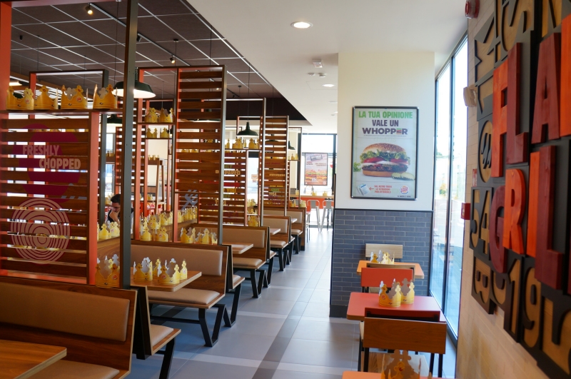 Il nuovo design dei ristoranti Burger King si compone di numerosi elementi di arredo che permettono di dare ritmo e dinamicità alla configurazione interna, grazie a colori vivaci - rosso, verde e giallo uniti al marrone - per richiamare gli ingredienti del mitico whopper, e materiali naturali di cui il legno è la base principale.