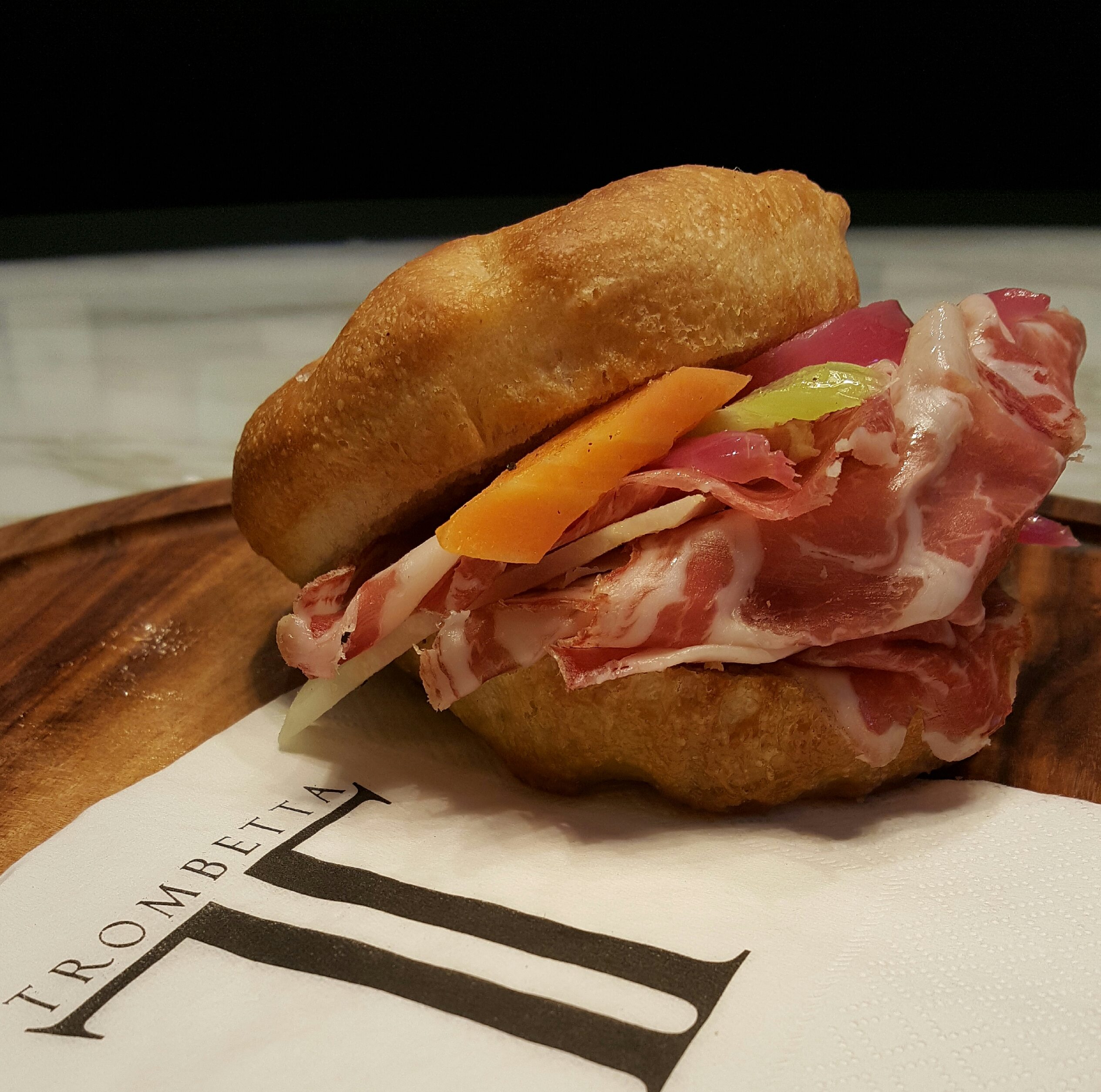 Quindi anche una focaccia con la mortadella può essere gourmet, come insegna Francesco Manzi chef executive della Trattoria Trombetta di Milano, osteria e cocktail bar serale (ma con brunch domenicale) fondata da Giancarlo Morelli dove si possono ordinare da apertura a chiusura del locale una selezione di panini gourmet, tra cui il panino di segale e noci con burro di sola panna e salamini affumicati dell’azienda Marco d’Oggiono, delizioso nella sua semplicità.