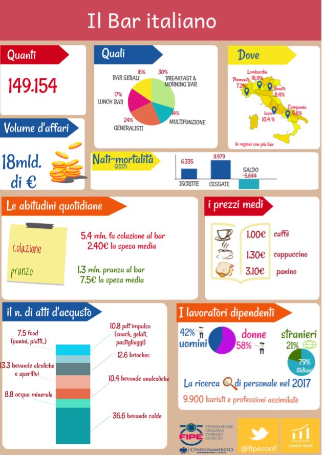 Per quanto riguarda la tipologia di esercizio, prevalgono i breakfast e morning bar (30%), seguiti da bar generalisti (24%), lunch bar (17%), bar serali (16%) e bar multifunzione (14%). Sul fronte occupazionale il bar italiano conferma il proprio fermento: i numeri Fipe sulla ricerca di personale nel 2017 parlano di 9.900 baristi. Il settore mostra sempre un andamento in "rosa", con la componente femminile in prevalenza rispetto a quella maschile (il 58% di lavoratrici dipendenti contro il 42% di lavoratori dipendenti). Il 79% dei dipendenti è di nazionalità italiana, mentre i dipendenti di nazionalità straniera si attestano sul 21%.