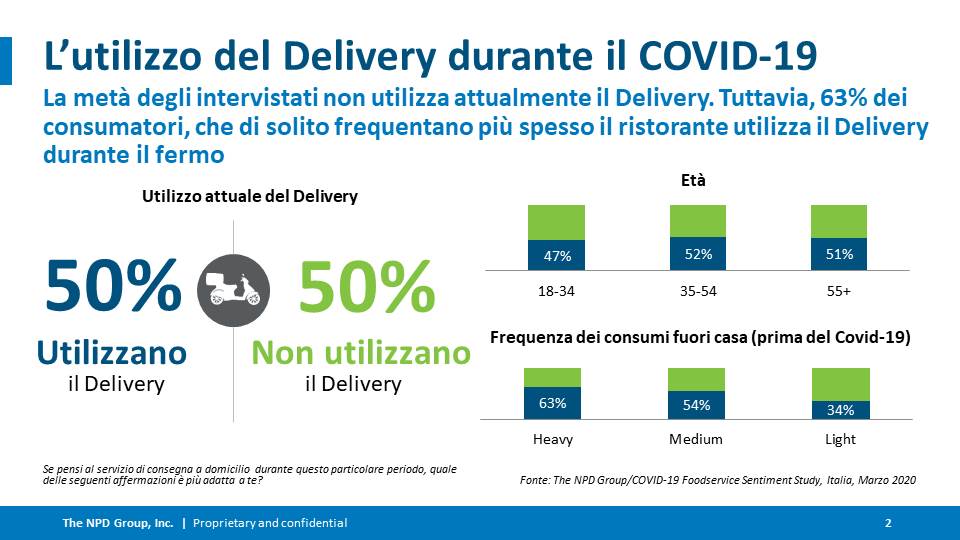 Dovendo stare a casa le abitudini sono certamente cambiate. Crescono in generale gli acquisti on line e anche nella ristorazione si fa ricorso alle consegne a domicilio. Li dove disponibile gli italiani ricorrono al delivery. Il 50% degli intervistati dichiara di far ricorso al delivery e la percentuale sale al 63% tra coloro i quali consumano fuori casa molto spesso. Matteo Figura, Direttore Foodservice Italia spiega che il delivery era un fenomeno in crescita già da prima e che alla ripartenza continuerà a crescere.“La crescita del delivery “ – continua Figura – “sarà data dall’attitudine a voler mantenere la distanza sociale ma anche la generale crescita degli acquisti e delle spese on line che per la ristorazione si traducono in delivery”.