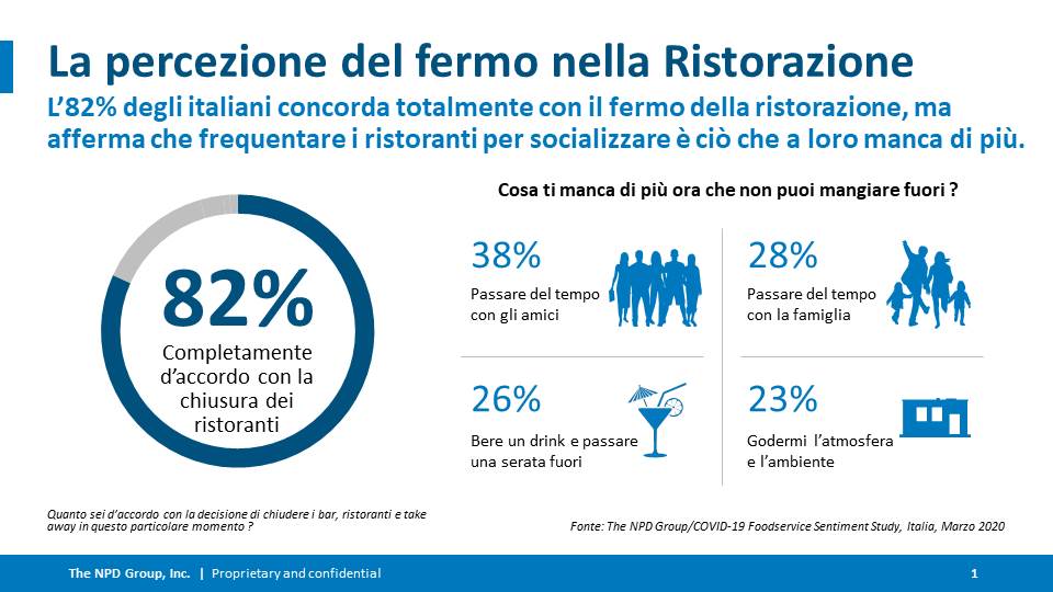 L’obbligo di rimanere in casa, anche se ben accetto, sta cambiando i comportamenti di consumo e il rapporto degli italiani con il cibo. Secondo NPD l’82% degli intervistati è completamente d’accordo con la chiusura di bar e ristoranti e per il 77% la riapertura dei ristoranti non è la priorità in questo momento. Tuttavia gli italiani soffrono la distanza sociale e di conseguenza sentono la mancanza dei luoghi di incontro e di socializzazione. La ristorazione è il luogo in cui si socializza e incontrarsi per mangiare fuori casa con amici e familiari sono i due aspetti che a agli italiani mancano di più quando pensano alla ristorazione.