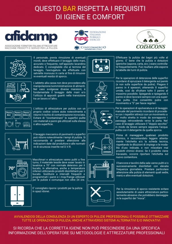 Ecco perché le tre associazioni di categoria hanno realizzato insieme il prontuario per le buone prassi di pulizia nei bar, uno strumento agile che si propone come un vero e proprio vademecum per le pulizie ordinarie che ogni locale è tenuto a fare per mantenere l’ambiente pulito e protetto.