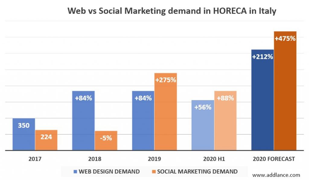 AddLance è in grado di ripercorrere l’andamento storico delle richieste delle imprese a professionisti, chiamati a realizzare siti internet. Nel 2017 e nel 2018, le aziende del settore Horeca erano concentrate, per lo più, sullo sviluppo di siti web e solo alcune pensavano di aumentarne la visibilità con azioni di social marketing. Nel 2019 e nella prima parte del 2020, il trend è cambiato: obiettivo delle Pmi non è solo avere o rinnovare il sito internet, ma soprattutto investire in social media management.