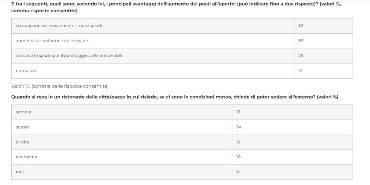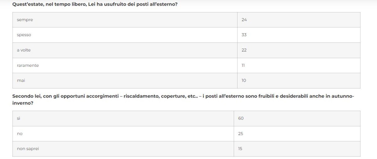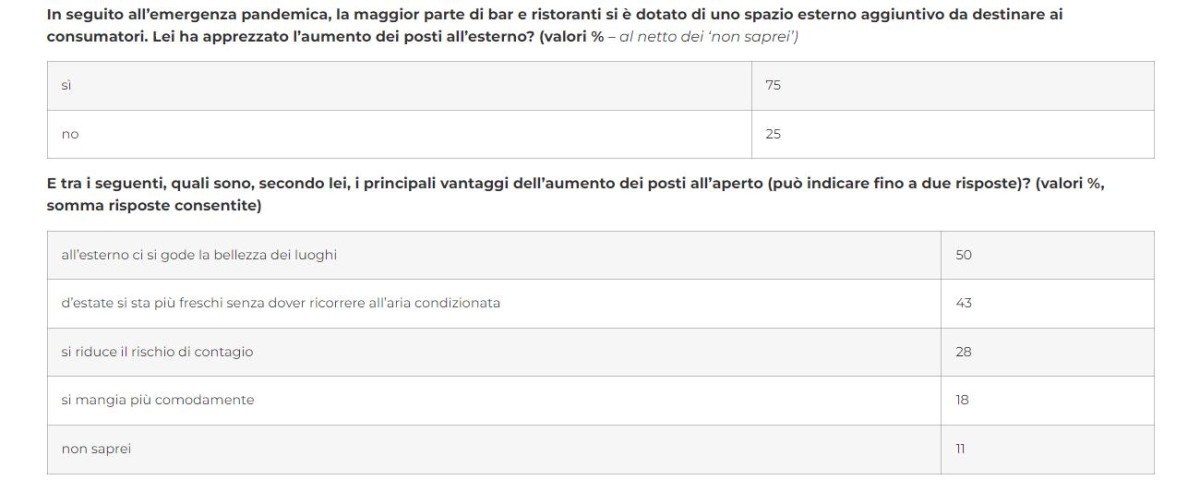 Una rivoluzione nella modalità di consumo, che è presto diventata un’abitudine gradita non solo ai turisti, ma anche ai residenti. Tra gli italiani che promuovono l’aumento di posti, il 50% ritiene che la maggior disponibilità di tavolini nelle piazze e nelle strade permetta di godersi meglio la bellezza dei luoghi, mentre un 43% preferisce il consumo all’aperto perché permette, d’estate, di stare più freschi senza aria condizionata.