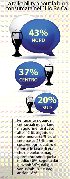 La talkability about la birra consumata nell’ Ho.Re.Ca. è maggiormente al Nord: 43 %, quindi segue il Centro col 37% ed infine il Sud col 20%; per quanto riguarda i ceti sociali ne parlano maggiormente il ceto alto: 42 %, seguito dal ceto medio: 35 % e dal ceto basso 23 %; uno speaker ogni quattro è donna; le fasce di età che ne parlano maggiormente sono quella media: 40%, seguita dai giovani : 34%, dai giovanissimi: 18% e dagli anziani: 8 %.