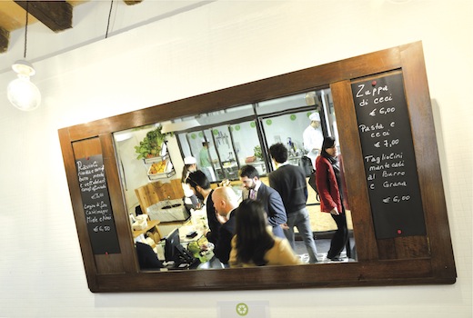 La cucina è a vista, sia dall’interno del locale che da Piazza di Firenze, e il design sofisticato, contemporaneo e curato, utilizza materiali e legni di recupero.