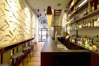 Sempre a Firenze, progettato dallo Studio Deferrari+Modesti, è interessante il locale La Petite Cocktail Restaurant. Ecco come viene raccontato il locale nel sito dei progettisti: “Molteplici sono le suggestioni che hanno corroborato l’idea attorno alla quale la parete ha preso forma. I paramenti murari e i lastricati di Firenze costituiscono un primo riferimento: pietre lisce giustapposte a rugose, superfici levigate accanto a scalpellate, rigate, bocciardate; la geometria, la tridimensionalità delle bugne. Le sculture parietali di Costantino Nivola hanno anch’esse lasciato la loro traccia nel disegno della parete. Nella parete dunque si ritrova l’elemento più riconoscibile dello spazio, la traccia che maggiormente riesce a connotarlo, ma senza una eccessiva fissità e rigidità, poiché è mutevole con la luce e produce, di ora in ora, effetti variabili grazie al disegno delle ombre. Per raggiungere questo risultato, la ricerca si è indirizzata nelle progettazione di un unico elemento in grado, a seconda della sua rotazione e della posizione degli elementi tra loro, di creare infinite configurazione variabili. La parete è stata poi realizzata scomponendo l’elemento in lastre triangolari di travertino, di spessore variabile, incollate ciascuna su supporti diversi. Per ottenere la complessità geometrica ed il gioco di ombre ricercato, è stato studiata la posizione e la rotazione di ogni singolo pezzo.” Una parete quindi “su misura” figlia della forte esigenza di caratterizzare l’ambiente in maniera unica con pareti speciali. Il risultato è una superficie affascinante nuova e contemporanea ma che ha fortemente connotate le sue radici materiche.