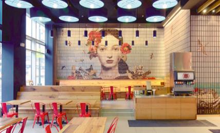 interessante è il ristorante Satya Orientale Kitchen di New York nel quale hanno lavorato parallelamente due studi: uno di architettura, ODA-Architecture in collaborazione uno studio di grafica: IF Agency. Le pareti del locale vengono ridisegnate grazie ad una grafica stampata su tavolette di legno che replicano una parete piastrellata fuori scala. L’elemento grafico decorativo e tradizionale va a contrastare con l’aspetto urbano del locale. Gli arredi, quali sedute, tavoli e banconi sono assolutamente contemporanei, come le luci disegnate su misura. Il mood del locale è innovativo e l’elemento caratterizzante è sicuramente il modo in cui sono state trattate le partizioni verticali. Un colore piatto avrebbe cambiato completamente l’immagine rendendo il locale molto meno riconoscibile. Il segno distintivo e la personalità del locale è proprio data dal carattere delle pareti.