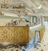 Un secondo esempio che utilizza il cambio di pavimento per disegnare gli ambiti funzionali differenti è il Gastrobar Kompaniya, progettato dallo studio DA architects a San Pietroburgo. Il pavimento ritaglia le aree di sosta vicino al bancone e alle sedute con ceramiche decorate lasciando le aree di flusso a parquet. Concettualmente le aree di attrazione della fruizione del cibo vengono evidenziate con le quadrotte decorate mentre le aree di scorrimento meno importanti vengono I designer giocano graficamente anche con il piano del bancone, attraverso il cambio di materiale; infatti alternano legno a marmo, creando un ritmo altalenante di materie e funzioni. In questo modo si vengono a gerarchizzare le aree attraverso il cambio di materiale.
