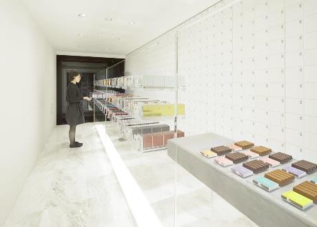 scatole colorate posizionate per nuance su supporti in perpex che galleggiano nello spazio. Questi supporti dalla faccia quadrata in verità sono dei lunghissimi cassetti che escono dalla parete bianca. Questi ultimi ricordano un caveau di una banca, dando quindi l’impressione che le confezioni fluttuino nello spazio senza gravità. Questa grande cassettiera è maneggiabile dagli utenti che possono scegliere fra gusti particolari come fragola, pepe, limone, frutto della passione e basilico. Lo spazio è composto anche da un’area degustazione con mescita di caffè, un lungo tavolone sociale e sgabelli per poter degustare il cioccolato.