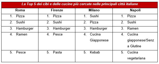 In riva all’Arno per pasta e fiorentina - A Firenze, dove gli utenti oltre a pizza e sushi apprezzano in particolare sia carne (terzo posto) che pesce (quarto posto), resiste anche la regina della cucina casalinga italiana, la pasta, che chiude la Top 5. Se poi, da un lato i fiorentini sono, dopo i napoletani, i principali sostenitori della cucina vegetariana (ottava posizione), al tempo stesso non sanno rinunciare a una tradizionalissima e succulenta fiorentina (nona posizione).
