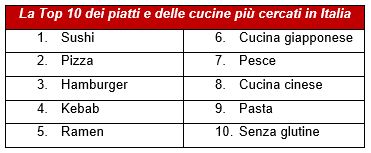 La top 10 dei piatti preferiti dagli italiani - La classifica dei dieci piatti più ricercati dagli Yelper in Italia testimonia la netta predilezione degli italiani per i sapori orientali. Il Sol Levante ha un deciso ascendente sulle scelte gastronomiche degli italiani: se prima c’era solo il sushi – che rimane comunque la scelta imbattuta al primo posto della top 10 – cresce la curiosità per il ramen (quinto posto) seguito dall’insieme delle specialità gastronomiche giapponesi. Altra tendenza che emerge prepotentemente è la predilezione dei nostri connazionali per pasti veloci e informali – testimoniata dalla presenza in classifica di pizza, hamburger e kebab – che viene ribadita anche dall’interesse per street food e piadine che risultano tanto popolari da piazzarsi rispettivamente al tredicesimo e quattordicecismo posto. L’analisi di Yelp sottolinea anche la crescente attenzione degli utenti verso il cibo “healthy” e le cucine che promuovono una precisa scelta etica: le pietanze senza glutine chiudono infatti la top 10, mentre le specialità vegetariane e vegane si trovano rispettivamente in undicesima e dodicesima posizione.