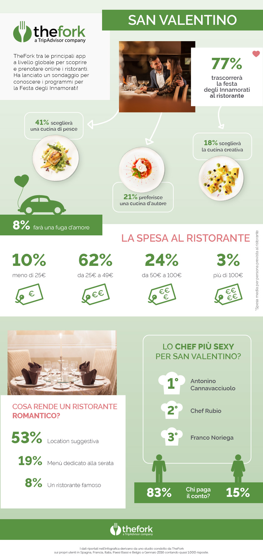 Una romantica tradizione - Il 77% degli utenti italiani ha dichiarato la sua intenzione di festeggiare San Valentino al ristorante contro il 61% dell’anno scorso. I restanti 14,5 % e 8% ne approfitteranno invece per restare a casa o concedersi una romantica fuga fuori porta. La tendenza è simile in altri Paesi europei: anche in Francia, Spagna, Paesi Bassi e Belgio, la festa degli Innamorati si celebra a tavola.