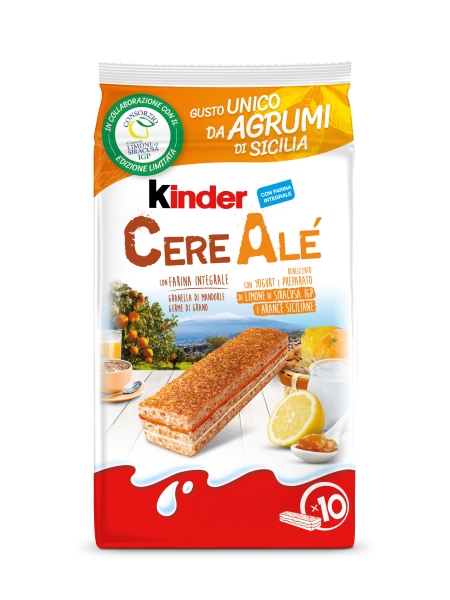 Oggi Kinder CereAlé, eletto prodotto dell’anno 2017 per la prima colazione, estende la sua gamma introducendo un nuovo gusto, Kinder CereAlé Agrumi. Kinder CereAlé Agrumi, fatto con pan di spagna con farina integrale, impreziosito di granella di mandorle e germe di grano, si distingue per la sua nuova farcitura di agrumi siciliani con Limone di Siracusa IGP e crema di yogurt, una ricetta semplice e autentica perché il “sapore di domani” è un “sapore di ieri” sapientemente combinato e re-interpretato.