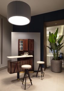 L’ingresso - L’ingresso evoca immediatamente il legame con Milano e la sua storia, con un originalissimo mobile bar degli anni ’50 disegnato da Osvaldo Borsani. Il legno della struttura e il marmo del ripiano creano un raffinato contrasto con le tinte argentate della quinta e con il blu di sfondo che richiama il logo del ristorante e conferisce profondità all’ambiente. Completano lo spazio i pouf in velluto e il grande lampadario circolare in tessuto. Le pareti tortora e blu sono decorate con bacchette in legno noce canaletto a tutta altezza che ritmano lo spazio, nascondendo ante apribili e armadi contenitori.