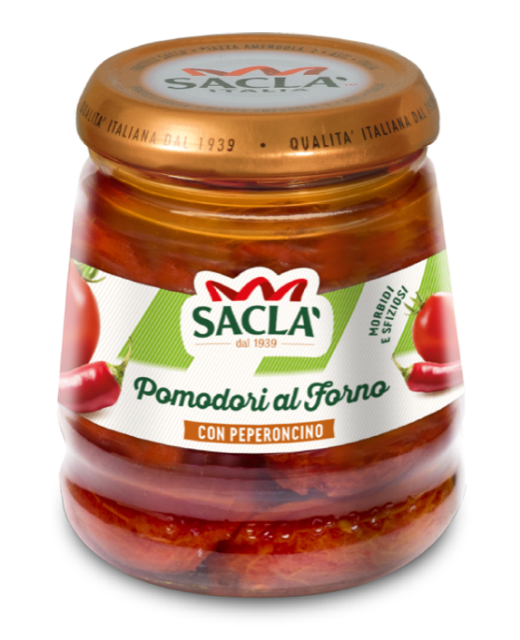 I pomodori che Saclà seleziona per questa ricetta arrivano solo da aziende agricole delle zone di produzione più vocate d’Italia che ne garantiscono il rispetto della stagionalità, riducendo al minimo l’impatto ambientale. Vengono poi lavorati appena raccolti, sbucciati uno ad uno, salati e parzialmente disidratati in forno, in modo da preservarne quanto più possibile le caratteristiche organolettiche e le proprietà naturali. I Pomodori al Forno Saclà sono al 100% naturali, senza conservanti, resi più gustosi grazie ai tipici sapori del Mediterraneo: il peperoncino con la sua nota piccante e decisa, oppure le olive nere ed erbe aromatiche, per gli amanti dei sapori più delicati. Morbidi, succosi e ricchi di sapore, i Pomodori al Forno sono una specialità Saclà davvero unica e molto versatile in cucina: possono essere gustati in purezza come antipasto, oppure possono essere ‘quel tocco’ in più che rende più gustoso un primo piatto o il condimento della pizza.