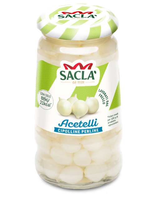 Piccole e brillanti, come fossero perle, croccanti e delicate per stuzzicare l’appetito: sono le Cipolline Perline che Saclà seleziona dai migliori raccolti in Italia e propone nella linea Acetelli. Anche note come Maggioline per il periodo in cui vengono raccolte, le cipolline Perline sono un prodotto unico e tipicamente italiano, coltivato nelle pianure del Veneto e nelle zone di confine dell’Emilia-Romagna. Una semina fitta e una raccolta anticipata ne garantiscono la dimensione ridotta caratteristica, mentre la crescita e il riposo per tre mesi sotto un leggero strato di terreno sabbioso ne permettono la formazione e ne preservano la brillantezza. Il risultato? Una vera perla di gusto che Saclà preserva, rendendola ancora più preziosa.