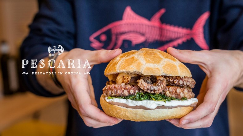C’è solo l’imbarazzo della scelta leggendo il menu di Pescaria: dal Mare Crudo (ostriche, cozze pelose, tagliatelle di seppia, noci, gamberi e tanto altro) alle Tartare (salmone, tonno e gamberi), passando per le Insalate, il Pesce Cotto, le Fritture (Fish & Chips, paranza, alici, polpette di crostacei, frittura mista) e naturalmente i Panini di pesce: imperdibili quelli con il Polpo fritto (polpo fritto, rape aglio e olio, mosto cotto di fichi, ricotta e pepe, olio alle alici) e con i Gamberoni al ghiaccio (gamberoni leggermente bolliti, melanzana infornata, fior di latte, pancetta Santoro, chips di patate, rucola fresca, salsa artigianale con ketchup e maio della casa).