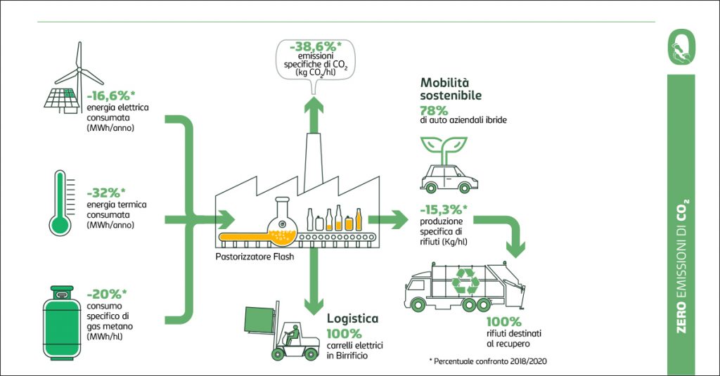 Presso lo Stabilimento produttivo di Induno Olona, grazie all’entrata in funzione a pieno regime del Pastorizzatore Flash, nel 2020 sono stati risparmiati il 16,6%* (MWh/anno) di energia elettrica consumata, il 20%* (MWh/hl) di consumo specifico di gas metano, e il 38,6%* di emissioni specifiche di CO2 (kg CO2/hl). Il tutto migliorando anche l’ambiente di lavoro degli operatori grazie ad ambienti meno umidi e più freschi, rispetto al pastorizzatore a tunnel.