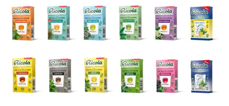 L’innovazione di Ricola si concretizza attualmente anche nel packaging dei prodotti che è stato rivisitato e modernizzato partendo dalla scelta della palette cromatica dei prodotti, che da oggi hanno nuance più pastello. I vari gusti mantengono il loro codice colore e seppure più tenue rimangono ben identificabili; la nuova palette di colori ben si fonde con l’immagine naturale del brand.In aggiunta è stata aggiornata la disposizione grafica, così da evidenziare l’ingrediente fondamentale ed elemento distintivo delle caramelle Ricola, le erbe dalle alpi svizzere, e il gusto, più centrale e quindi ancora più leggibile.