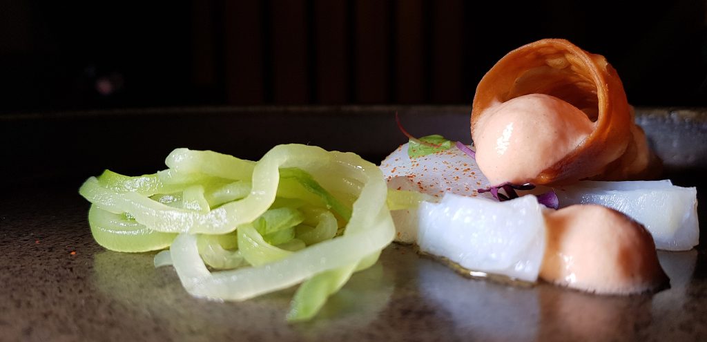 Sashimi di baccalà con crema di burrata, spuma di datterino e spaghetti di cetrioli in osmosi[/caption]
