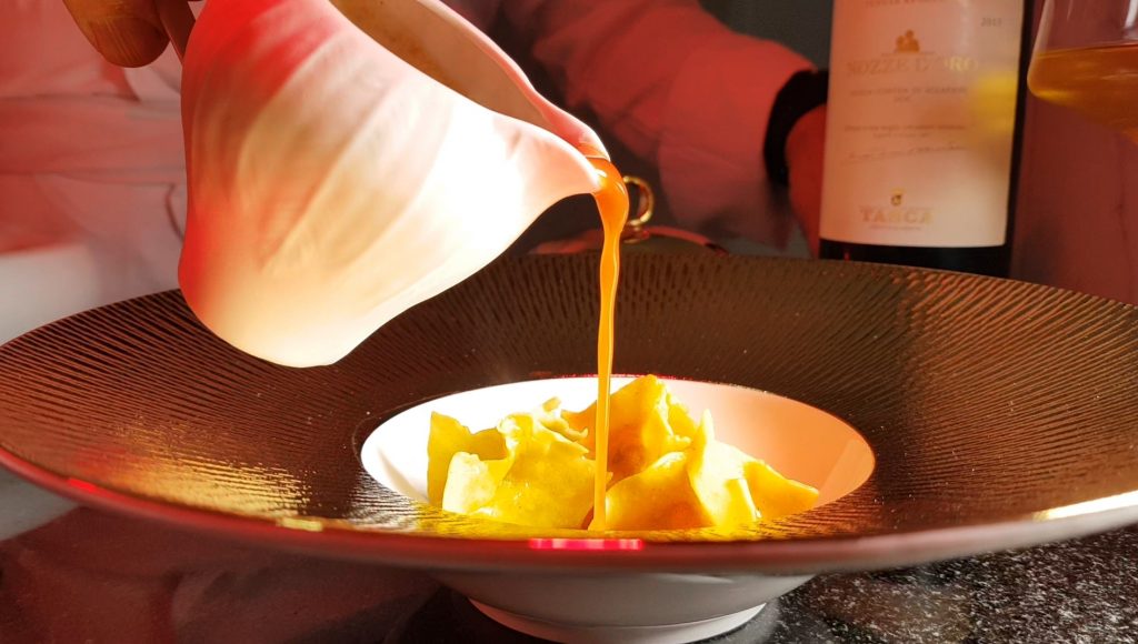 I canestrini dei Nebrodi, con ripieno di suino nero dei Nebrodi su zuppa di pesce[/caption]