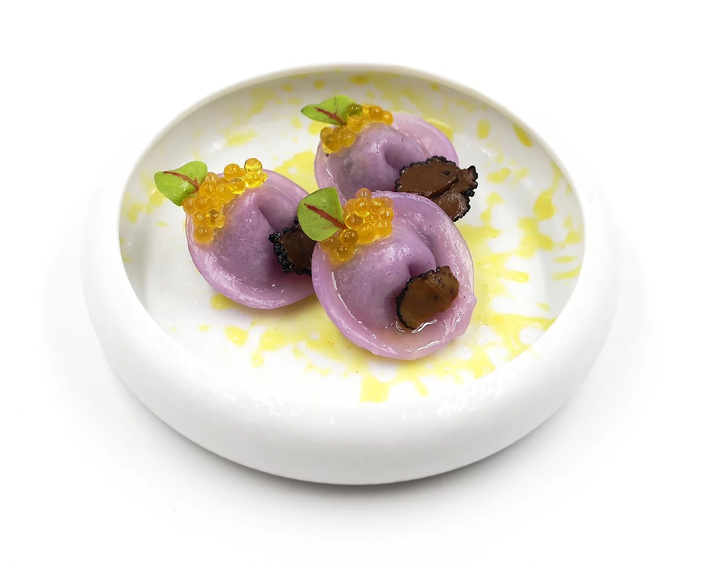 Non si tratta solo di estetica: spesso i piatti di Xin Ge Liu vogliono trasmettere emozioni e nascono da vicende e momenti personali. Così ad esempio “Emotion”, un raviolo nero di taro avvolto in una “rete” di fungo ripieno di edamame e bambù, richiama il desiderio di uscire dal caos e trovare la pace. Il pollo Shibari, già diven