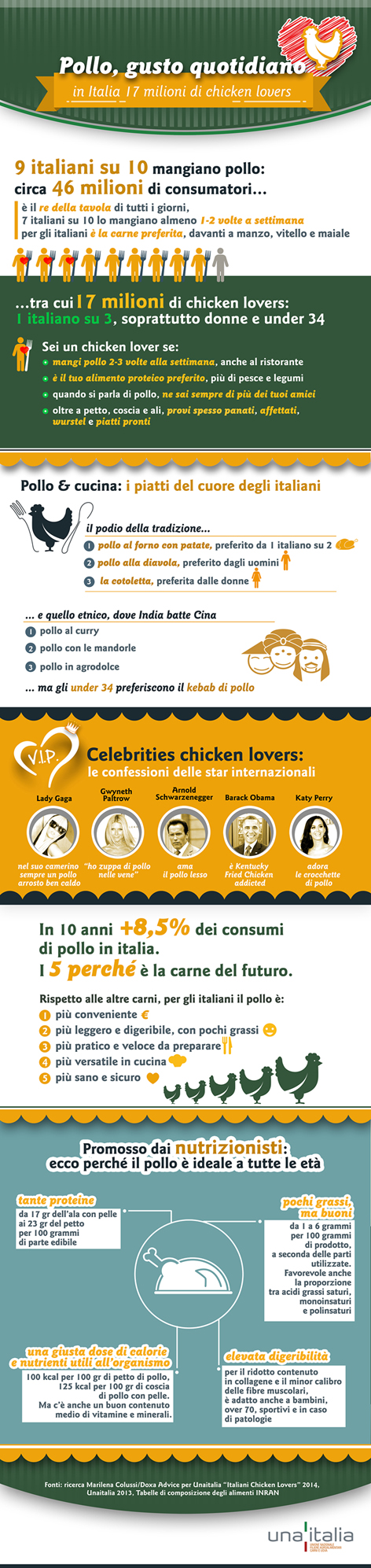 Si chiamano chicken lovers. Sono una particolare frangia di food lovers che amano particolarmente la carne di pollo, anzi sono veri e propri appassionati, come la food blogger Natalia Cattelani e l'attore Riccardo Rossi, qui in una intervista doppia. Per 9 italiani su 10 (46 milioni di consumatori) quella di pollo è la carne preferita, quella consumata più spesso e regina del pranzo domenicale. Lo rileva una ricerca effettuata da MarilenaColussi/Doxa per Unaitalia - l’Associazione che rappresenta la quasi totalità delle aziende del comparto avicolo – che racconta il legame tra gli italiani e uno degli alimenti simbolo della nostra gastronomia. Tanto che 7 su 10 lo portano in tavola almeno 1-2 volte a settimana. Vince nel confronto con le altre carni per convenienza, leggerezza, praticità e sicurezza. Ma in questo universo di consumatori, ce n’è un terzo, 17 milioni, che si dichiarano veri chicken lovers: mangiano pollo più volte, dalle 2 alle 3 a settimana, preferisce nettamente ad altri alimenti proteici (carni ma anche pesce e legumi) ed è più informato sul prodotto e sulla filiera rispetto alla media nazionale. I chicken lovers più convinti sono soprattutto under 34 e donne. Nell'infografica qui sotto una sintesi dei risultati della ricerca.