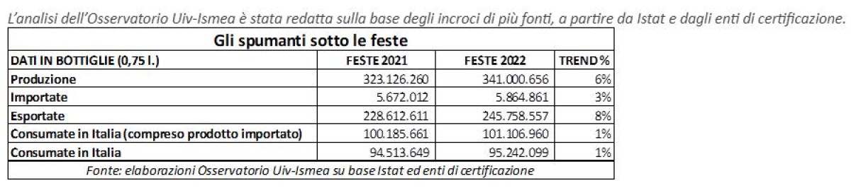 Secondo l’Osservatorio Uiv-Ismea nella sua consueta analisi sui consumi di sparkling per le feste, saranno 341 milioni le bottiglie di spumante italiano stappate tra Natale e Capodanno, sia in Italia (95 milioni) che, soprattutto, all’estero, sempre più testimone della febbre da Italian sparkling con i 3/4 delle vendite totali. Complessivamente, il 2022 chiuderà con un nuovo record produttivo molto vicino al tetto di un miliardo di bottiglie (970 milioni), per un controvalore di 2,85 miliardi di euro di cui circa 2 miliardi solo di export. A trainare la crescita, la domanda nei mercati chiave di Stati Uniti, Regno Unito e Germania, ma anche piazze consolidate ed emergenti, come Canada, Svezia, Giappone, Est Europa e Francia, sempre più attratta dalle bollicine italiane (+25% la crescita in volume nel Paese dello Champagne).