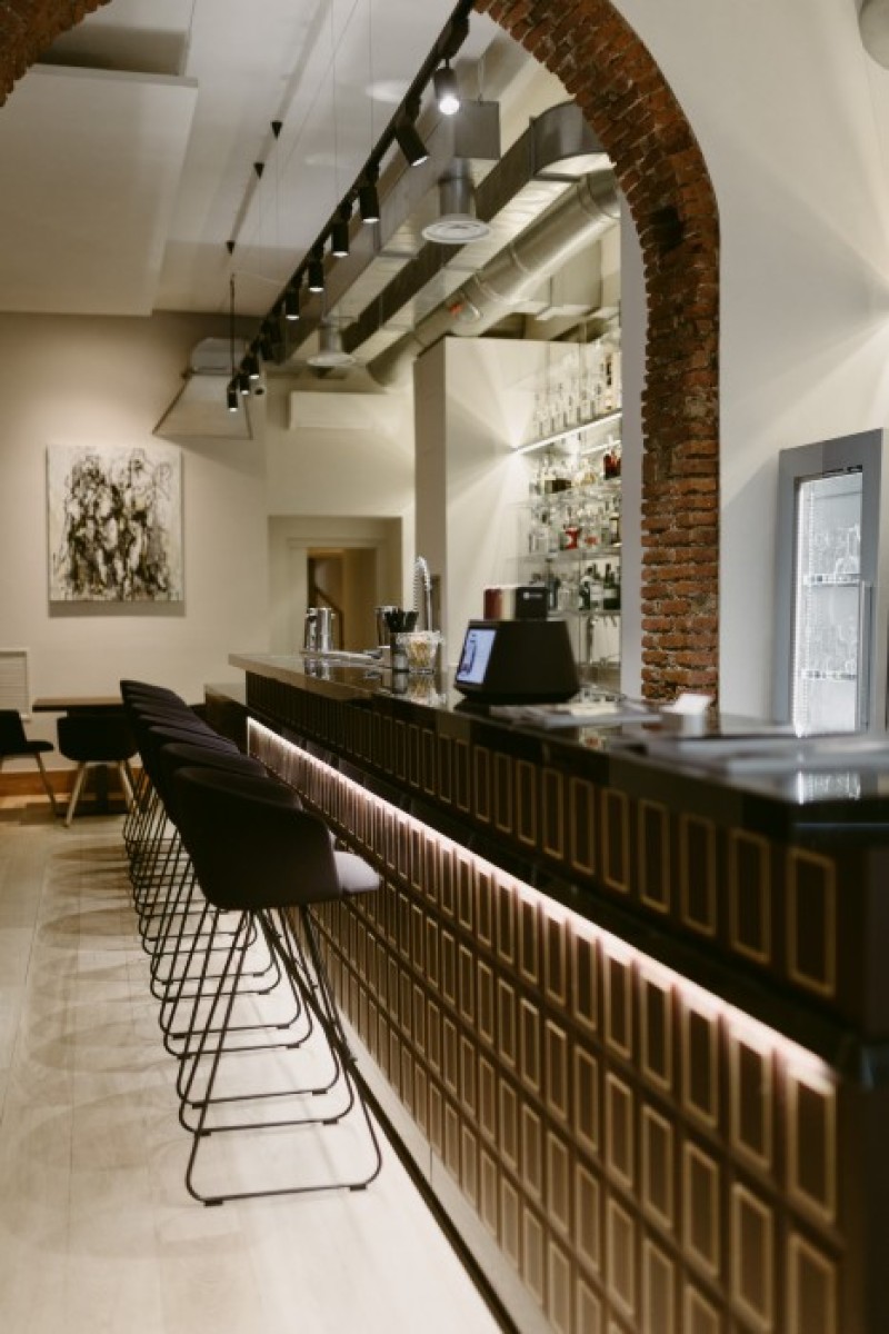 Quello della mixology al ristorante è una tendenza emergente che ogni nuova apertura difficilmente può ignorare, e infatti e forse non a caso l’ingresso su via Solferino è tutto dedicato al bar, con una zona lounge e il lungo bancone del cocktail bar, un pezzo unico realizzato da un artigiano lombardo, che si sviluppa in profondità.