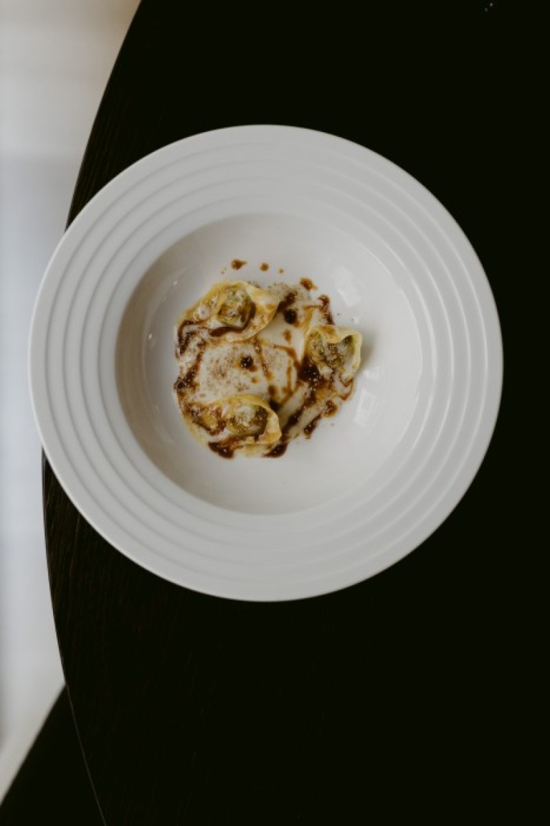 La materia prima – a parte tre o quattro ingredienti - è tutta italiana, l’arredamento è tutto Made in Italy e la mia squadra è formata da tutti ragazzi italiani” spiega Quadri. Il suo piatto più rappresentativo è il raviolo croccante, sugo d’arrosto, salsa al Parmigiano e lievito di birra essiccato.