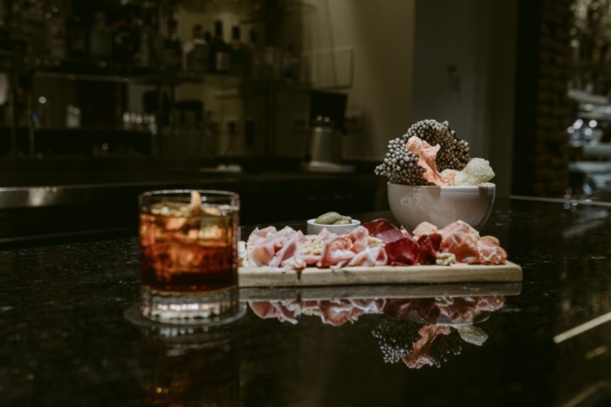 Al bar si può anche accomodarsi per uno snack e un cocktail, con una lista stagionale che comprende anche una decina di signature preparati dal giovanissimo (classe 2002) barman Cristian Caimmi. Tra questi un carezzevole The Fall, con Rum alle pere, Sciroppo di castagne, Marsala alle pere, succo di lime e il Quadri-tini (Vodka, Gin, extra Dry Vermouth).