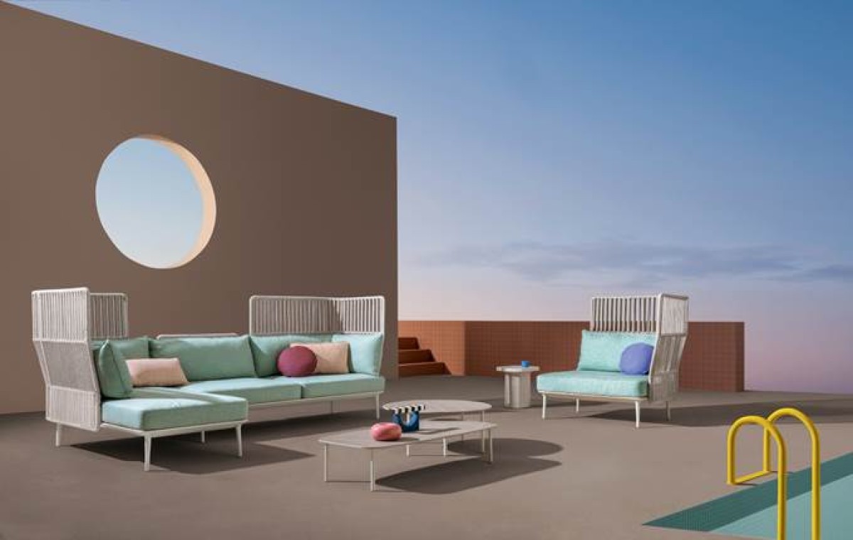 È caratterizzato da importanti schienali in acciaio inox ricoperti da un intreccio in corda in polipropilene resistente agli agenti atmosferici, realizzato in Italia da esperti artigiani. Il concetto di avvolgenza viene inoltre esaltato dai morbidi cuscini che si poggiano alla struttura e da cuscini disponibili in diverse forme: rettangolare, quadrata e tonda.