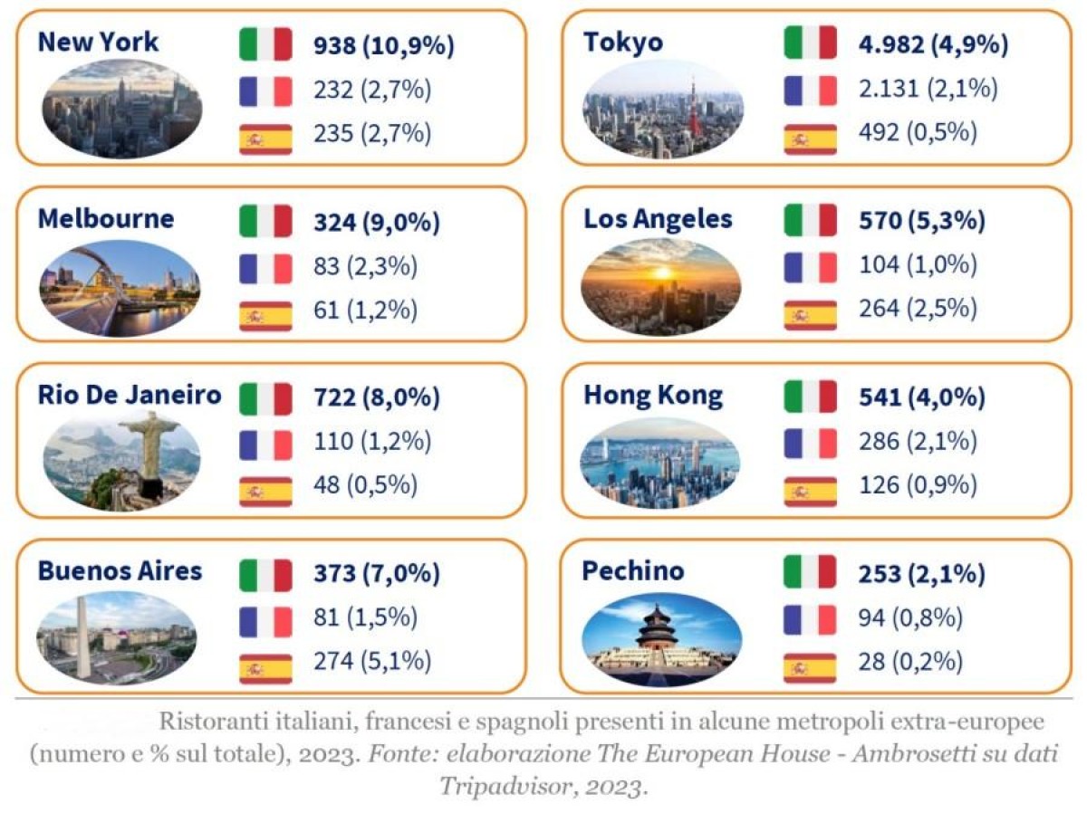 In America del Nord la differenza è molto marcata: 938 ristoranti italiani a New York rappresentano il 10,9% del totale, ma i francesi si fermano a 232 (2,7%), stessa quota degli spagnoli. Sulla costa ovest l’amore per l’italianità è lo stesso: a Los Angeles i 570 ristoranti italiani rappresentano il 5,3% del totale, mentre quelli francesi si fermano a 104 (1%) e gli spagnoli arrivano a 264 (2,5%). Anche a Melbourne Italia è sinonimo di buona cucina: 324 ristoranti italiani (il 9% del totale), 83 francesi e 61 spagnoli. Anche in Sud America la sproporzione è evidente: a Rio de Janeiro la cucina italiana conta 722 locali dedicati (8% di tutti i ristoranti), 110 francesi (1,2%) e 48 spagnoli, mentre a Buenos Aires gli spagnoli (274) superano nettamente i francesi (81), ma non gli italiani: 373 ristoranti in totale, il 7% di tutti i locali della capitale Argentina.